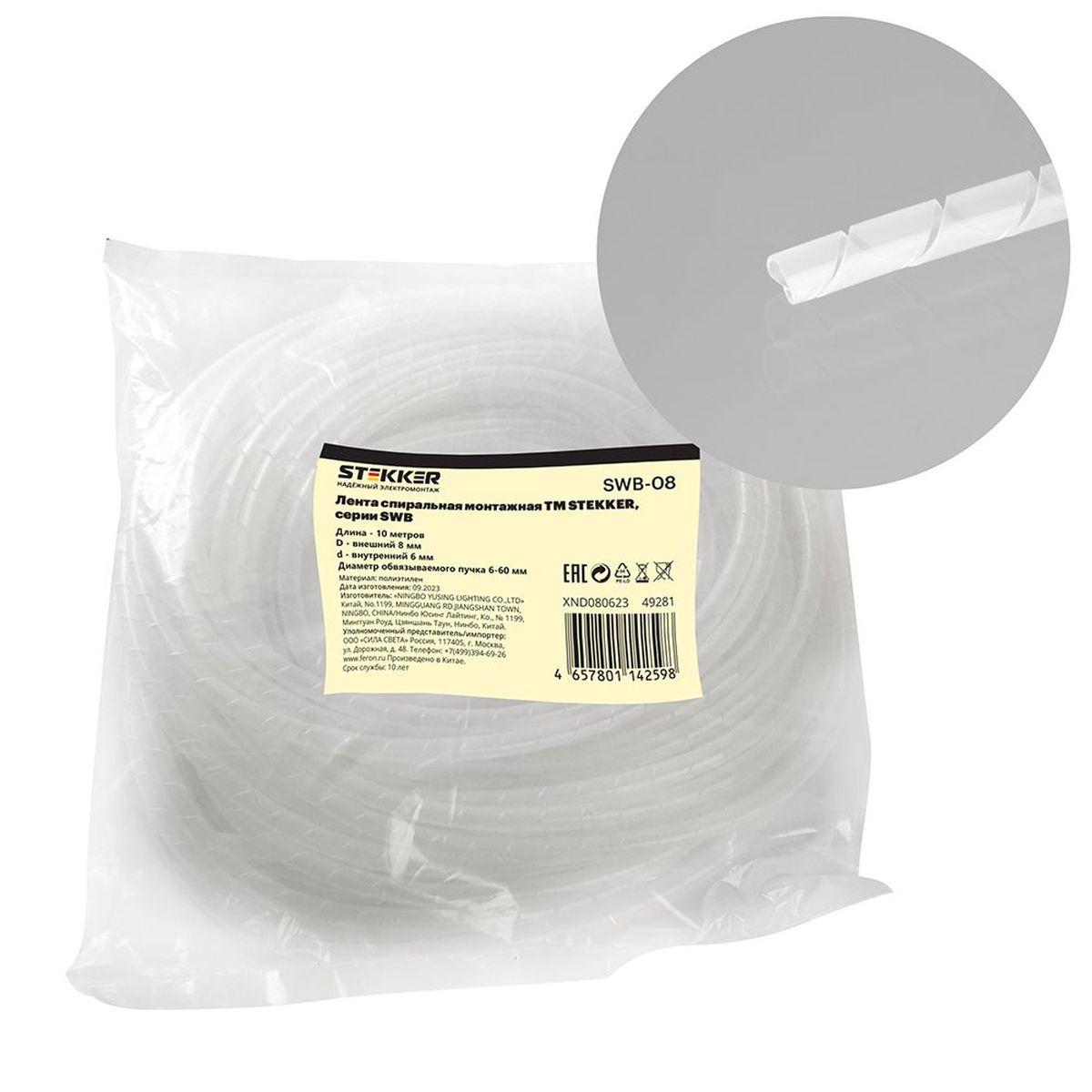 —Лента спиральная монтажная Stekker, диаметр пучка 6-60 мм, 10 м/упак, белый, SWB-08 49281
