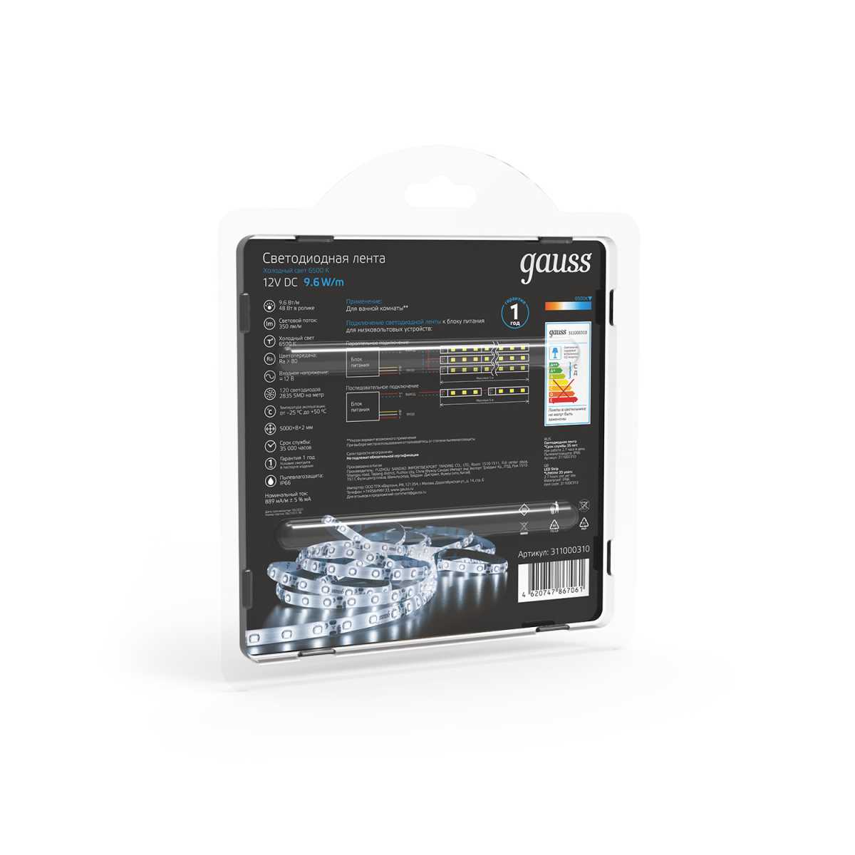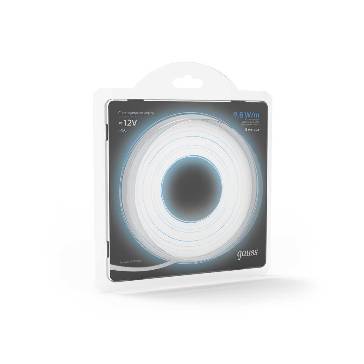 —Светодиодная влагозащищенная лента Gauss 9,6W/m 120LED/m 2835SMD холодный белый 5M 311000310