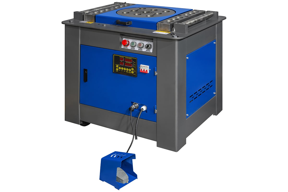 • простота в обслуживании и эксплуатации; • точность угла гибки ; • повышенная работоспособность и износостойкость; • управление при помощи педали; • надежность – детали станка хорошо закреплены и защищены; • Максимально допустимый диаметр арматуры 38 мм; • Мощность 4 кВт; • Оптимальное соотношение цены и качества.